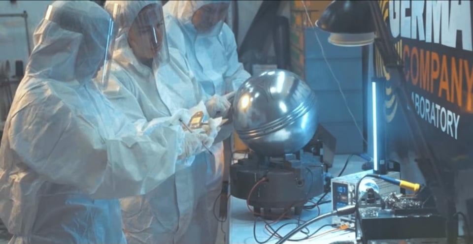 The base they are using to hold up the sphere in the lab is a lathe chuck. Not sure if that means anything either way, I mean it’s a practical way to hold a sphere (3 adjustable points). But I do find it weird they have a wire running into one of the tracks of the jaws