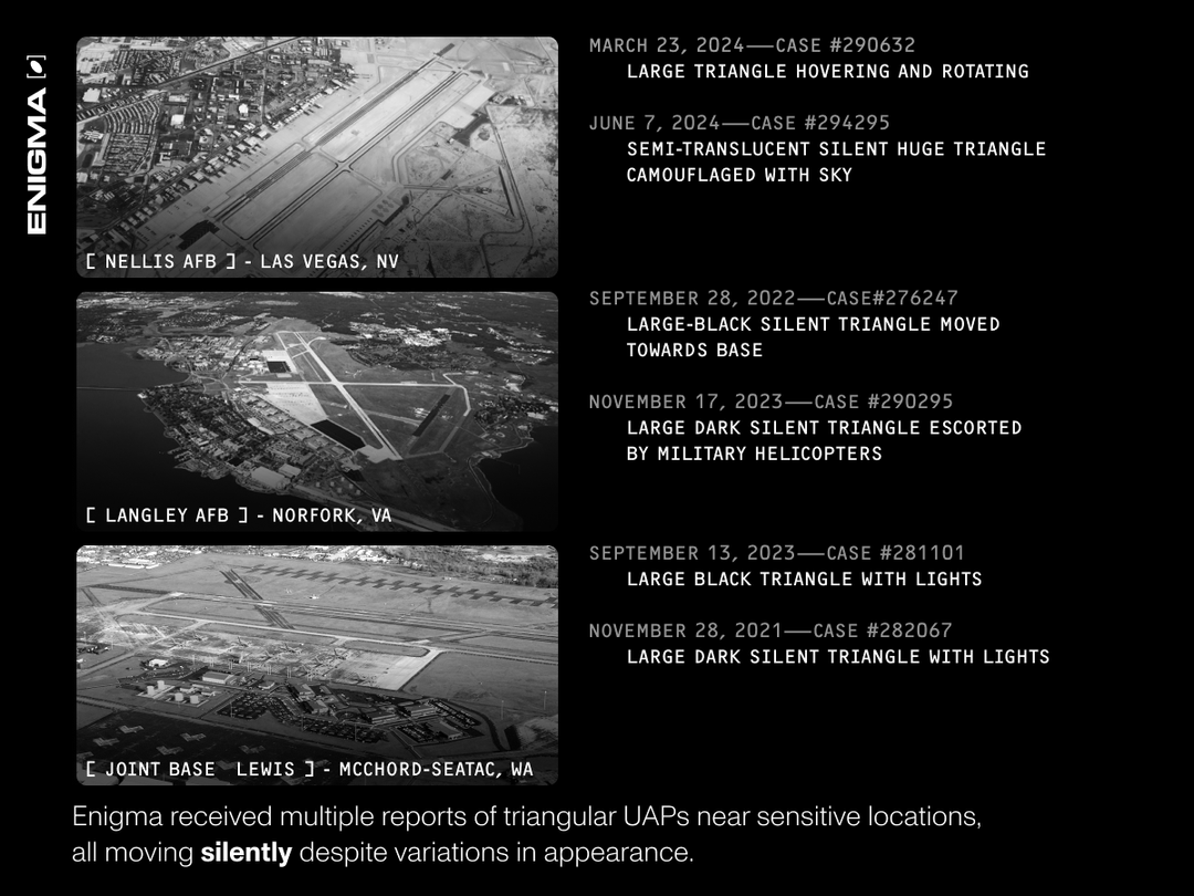 We’ve received multiple reports of triangle shaped UAPs near sensitive or strategic sites, including Nellis, Langley, and McChord. While shapes and details vary, nearly every one of these reports included a consistent detail. The objects moved silently.