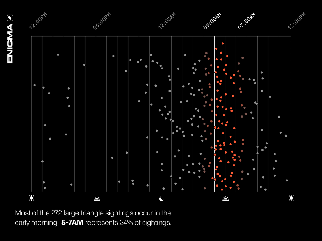 A major cluster of large triangle sightings happens just before sunrise. 24% of the 272 occurred between 5 and 7 AM. Early morning hours continue to be a clear window of interest.