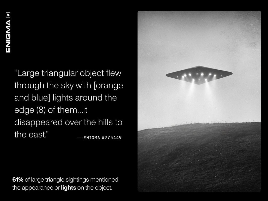 At Enigma, there have been 960 triangular UAP reports submitted between December 2022 and September 2024. 74% met our internal quality bar and were published for public research and review.