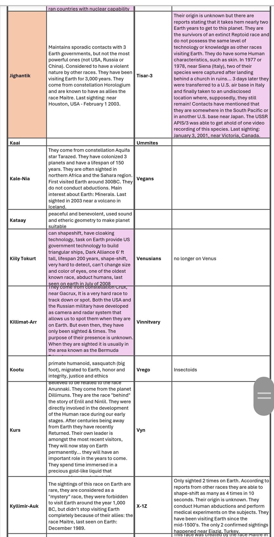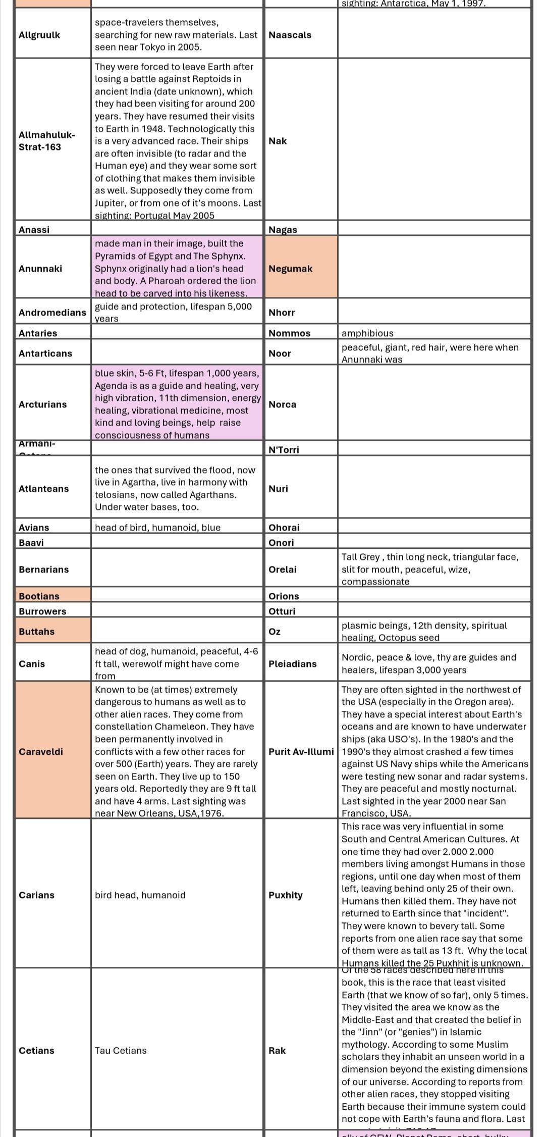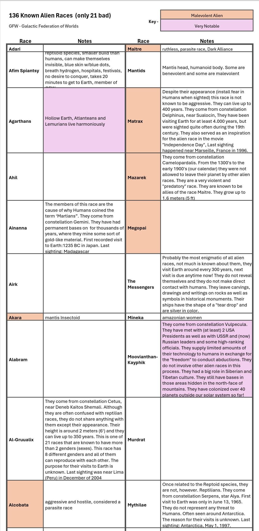 I compiled this list from Astral Legends TV: and The Book of Alien Races written by KGB. I confirmed every alien race with my guides and ny Arcturian buddy, Bloké. There's some pretty interesting information on this list. Blessings to all.
