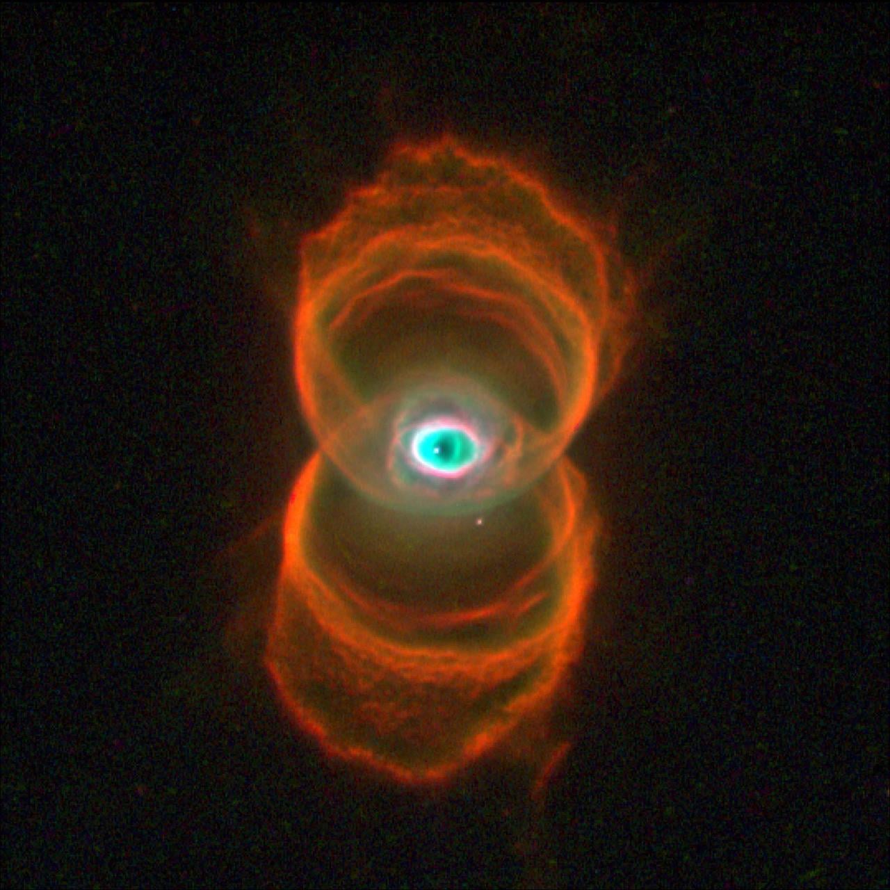 The Engraved Hourglass Nebula (MyCn 18) is a young planetary nebula in the constellation Musca, about 8,000 light-years away. It is the ejected outer layers of a dying star, and its intricate, hourglass-like shape is due to the complex interaction of stellar winds and gas. The nebula is known for its detailed patterns, which have been captured in stunning images by the Hubble Space Telescope