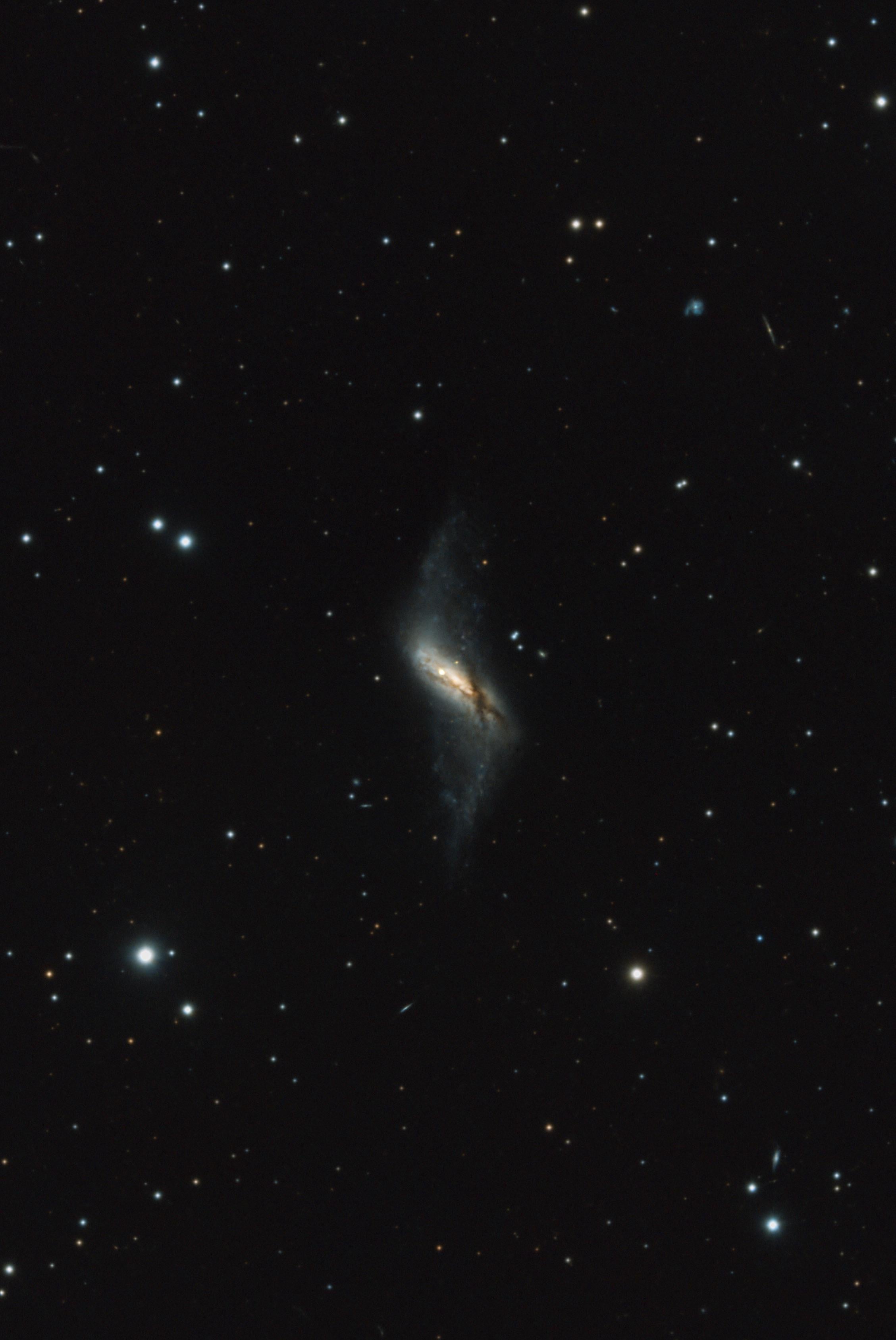 CartographerEvery268 on November 4, 2025 1:22 pm NGC 660 – Polar Galaxy 45M light years away The mess made when two galaxies collided over a billion years ago. -Telescope: Celestron 9.25” SCT @ f/6.3 w/reducer -Integration: 14x300s in Bortle 2 -Camera: ZWO ASI 2600MC @ -10*/100g -Guiding: Celestron off-axis guider w/174MM mini -Mount: Celestron CGX -Control: ASIAir Plus -Processing: PixInsight (stacking, solving, cropping, background extraction, spectro color calibration, BlurX, StarX, statistical stretch, star stretch, curves, NoiseX, pixel math)