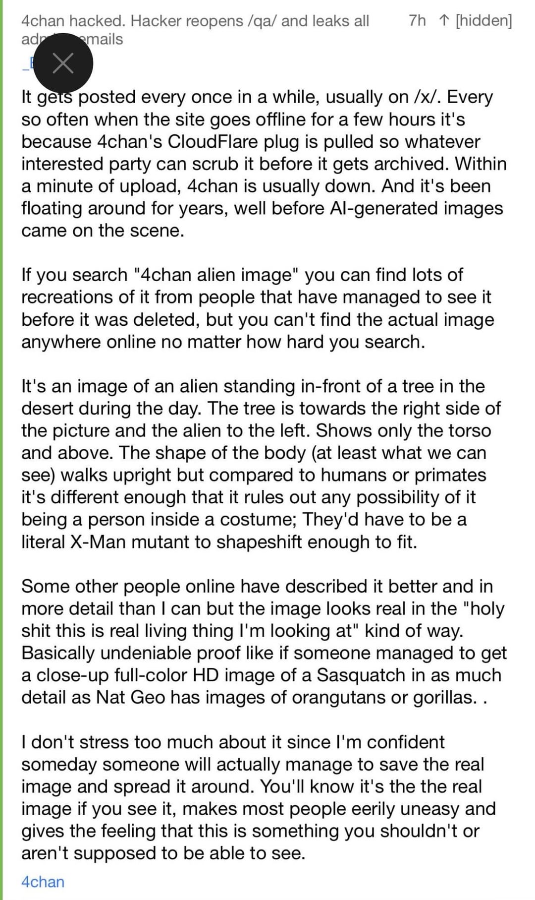 Some of these photoshops were meant to describe “this isn’t the photo, just my attempt to re-create & describe what I saw before the site went down” – and if you believe the lore, some of the images posted were meant to flood the zone and erode any confidence that anything “real” was ever posted. Know Your Meme debunked the main “this is it” photo that has the blue-pixelation overlay.