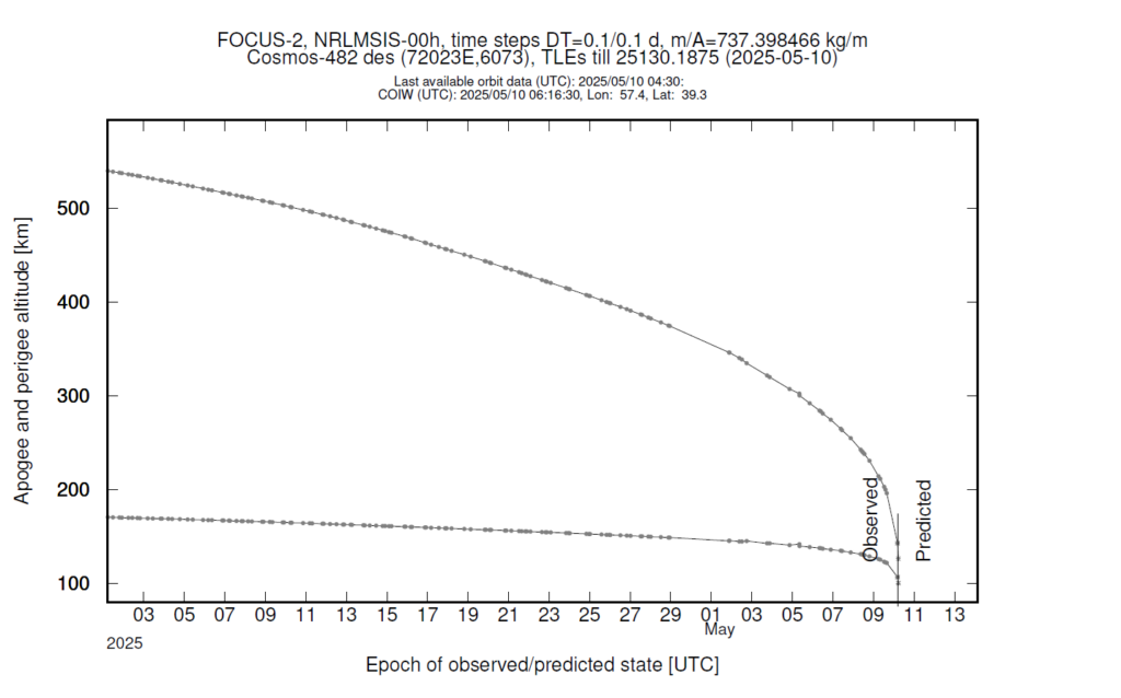 On 10 May 2025, an uncontrolled reentry took place of the Cosmos-482 descent craft, a Venera landing capsule that launched 53 years earlier. It was meant to land on Venus, but its launcher never escaped Earth’s gravity.