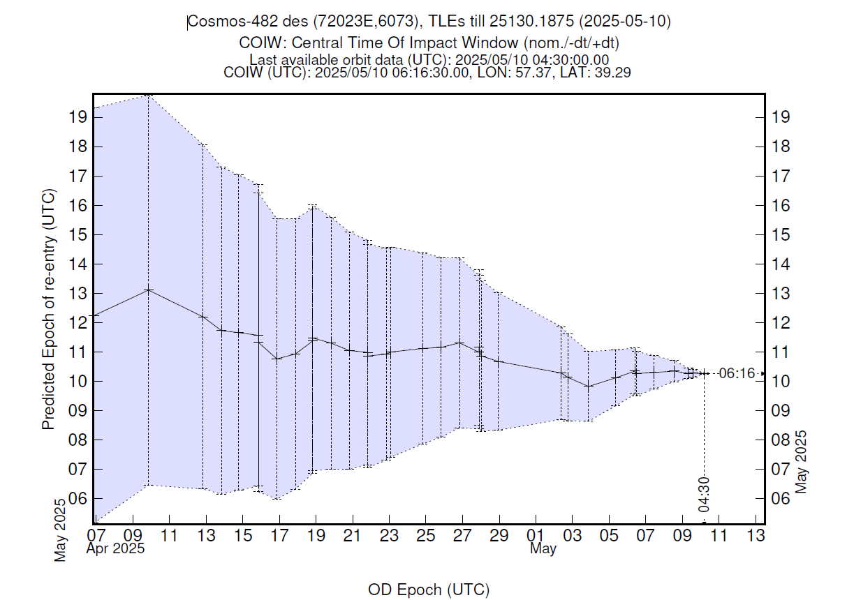 This post provided live reentry prediction updates (newer ones at the top) from ESA’s Space Debris Office on the atmospheric reentry of the Cosmos-482 descent craft.