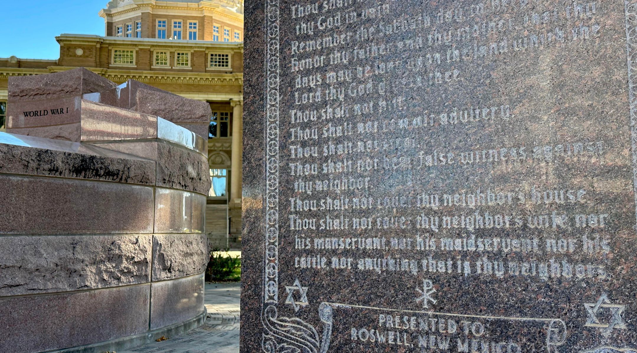 A granite monument in front of the Chaves County Courthouse in Roswell, New Mexico, displays the Ten Commandments and a Star of David. (Larry Luxner)