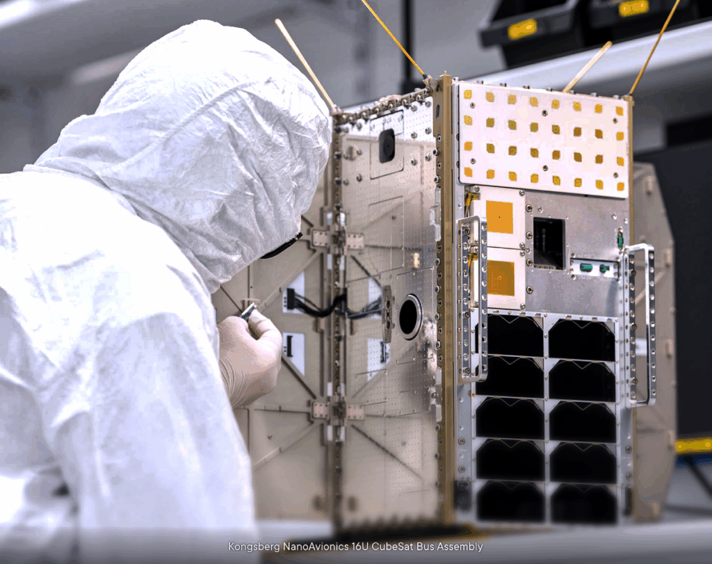 Kongsberg Nanoavionics engineer assembling a 16u cubesat. Kongsberg NanoAvionics 16U CubeSat Bus Assembly—photo courtesy of the company.
