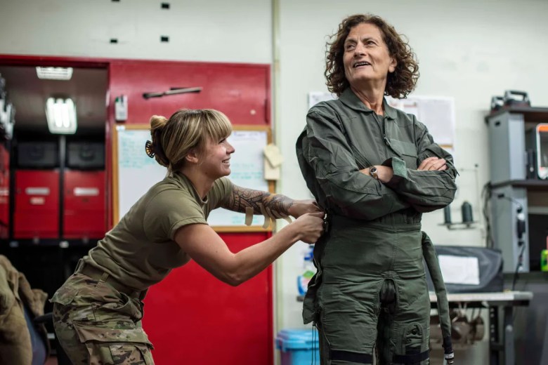Victoria Coleman, right, gets fitted for a flight suit in 2022. Coleman was previously the chief scientist for the U.S. Airforce. Courtesy U.S. Air Force/Airman 1st Class Sebastian Romawac.