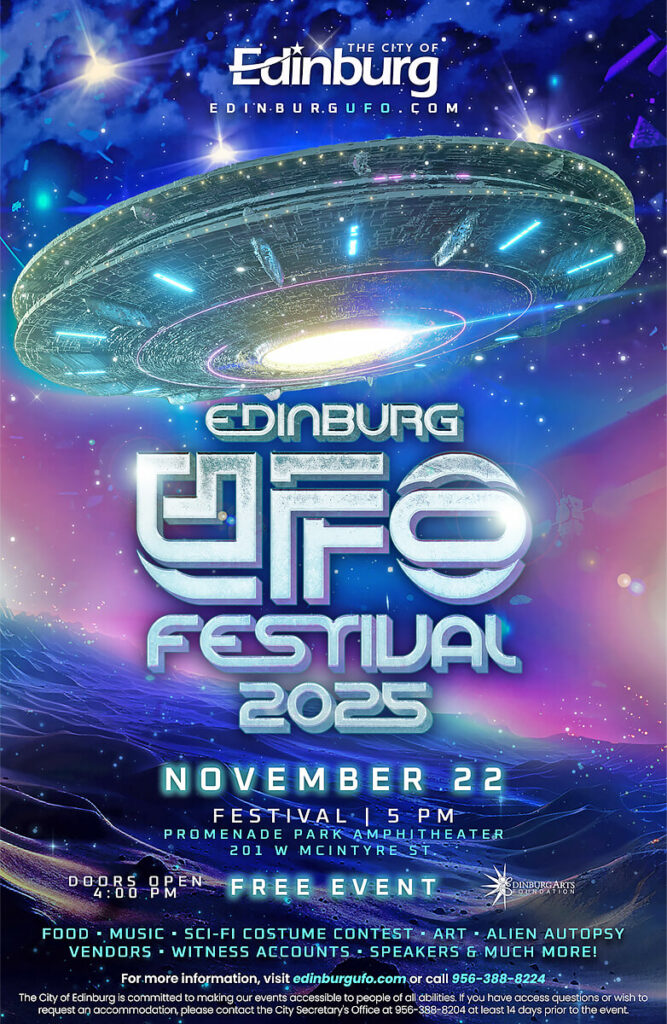 EDINBURG, Texas – The City of Edinburg is gearing up for a cosmic celebration as the annual UFO Festival & Conference returns to the Edinburg Arts, Culture & Events Center (ACE Center) from November 20–22, 2025. The three-day event will feature immersive panels, headline speakers, family activities, local lore, and a community-wide celebration of wonder and discovery.