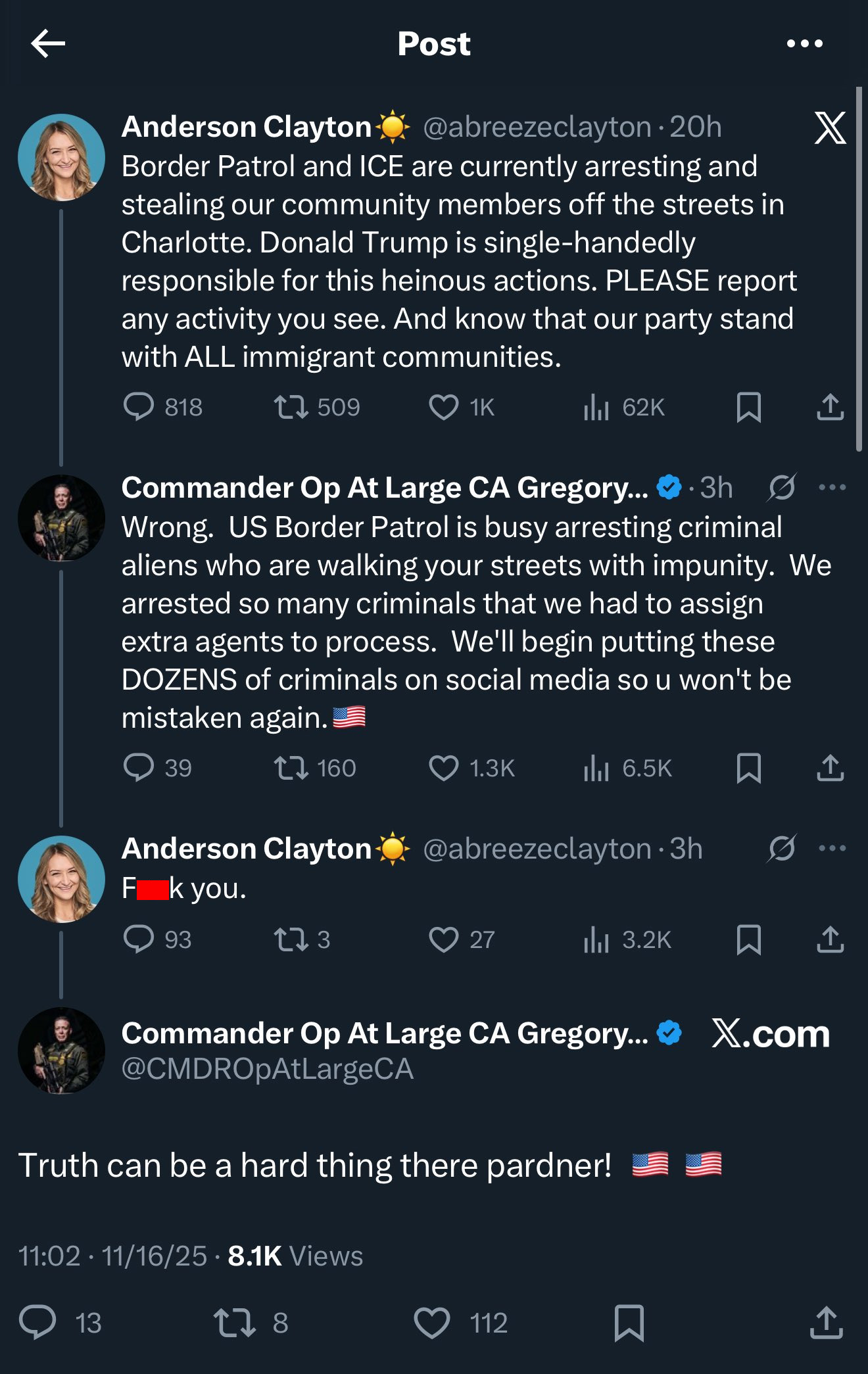 Anderson Clayton, chairwoman of the North Carolina Democratic Party, claimed on social media that CBP was ‘stealing’ members of the Charlotte community. When Bovino attempted to clarify what was actually happening, Clayton fired back with an expletive.
