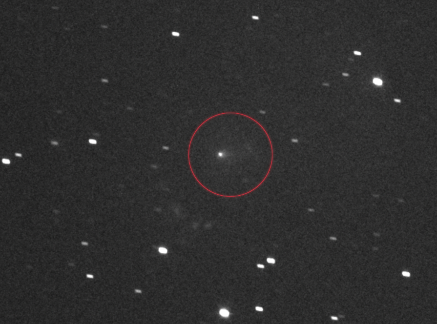The interstellar comet 3I/ATLAS, circled in the center, as seen by the L’LORRI panchromatic, or black-and-white, imager on NASA’s Lucy spacecraft. This image was made by stacking a series of images taken on Sept. 16, 2025, as the comet was zooming toward Mars.