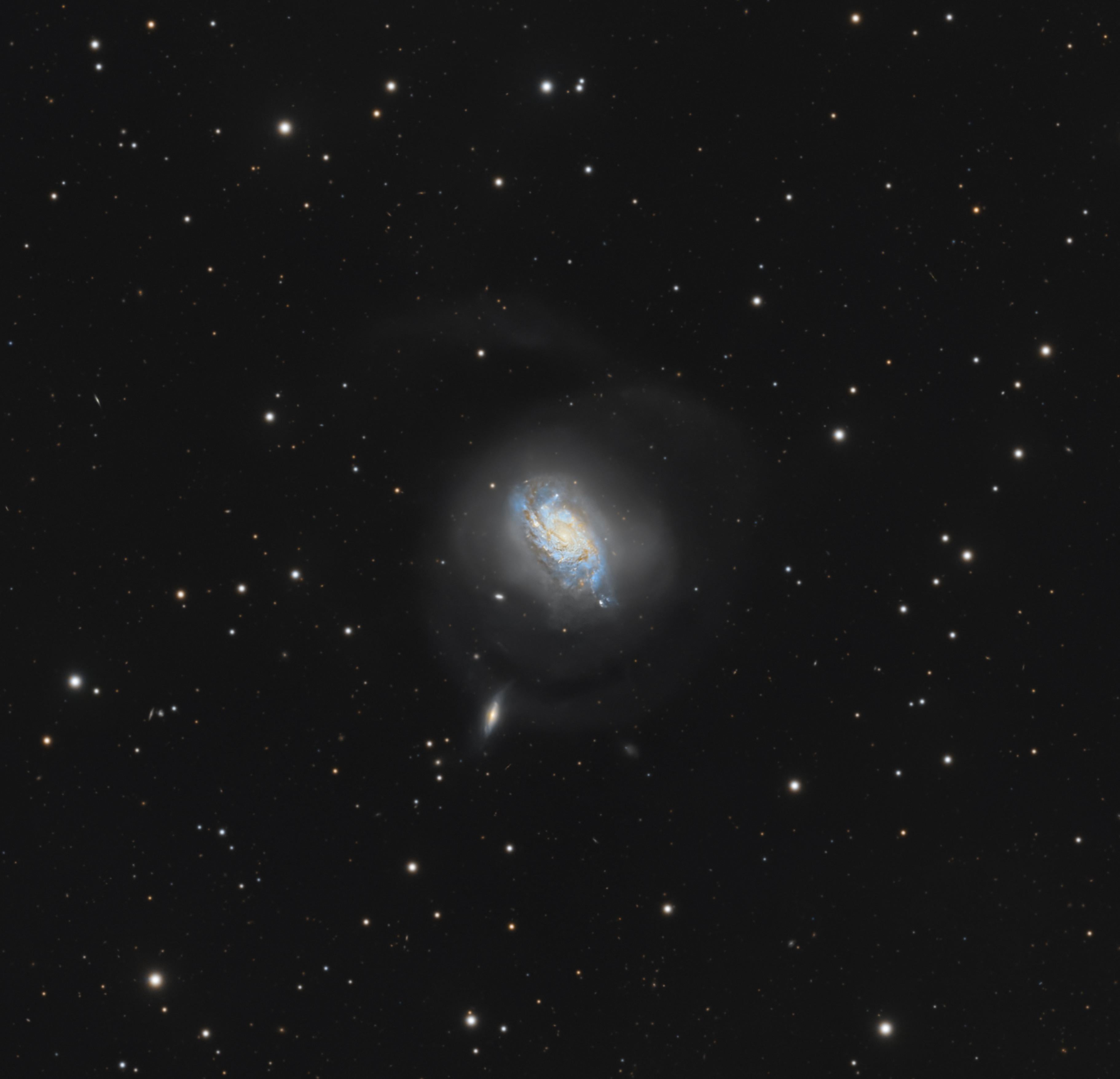 Galaxies never cease to amaze me. This one bears some resemblance to the Umbrella Galaxy, but its tail is entirely different and uniquely striking. We see its tidal arms winding around the galaxy, which is the glow made of millions of stars scattered by a past merger or the gravitational pull of another galaxy.