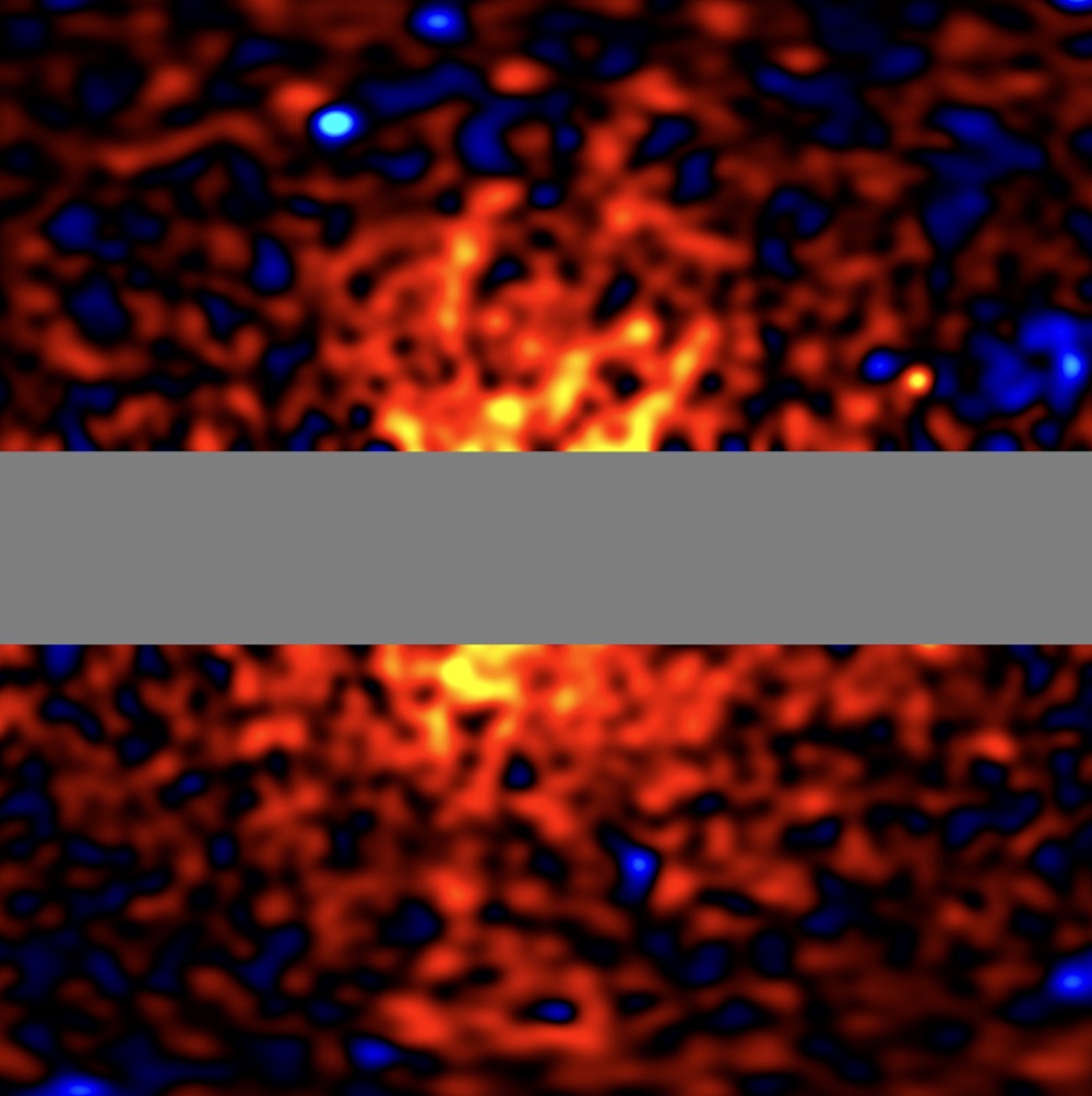 Map of gamma-ray intensity in the Milky Way. The horizontal gray stripe in the central region corresponds to the galactic plane, which was excluded from the analysis to avoid strong astrophysical radiation. Source: Tomonori Totani, The University of Tokyo