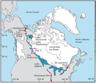 Southern Laurentide margin retreats in pulses, trapping water in massive proglacial basins (Agassiz, Iroquois, early Winnipeg).