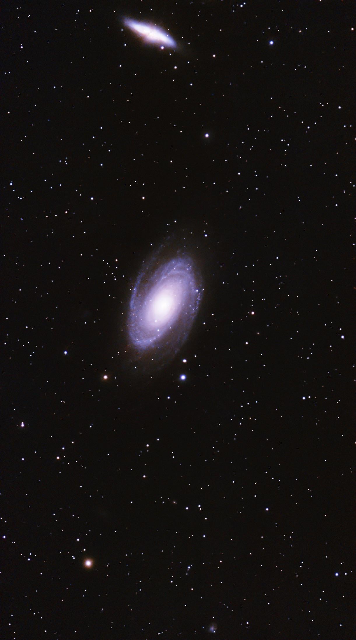 Brought up the contrast a bit on this one, but I love how it turned out. The slightly higher contrast on M81 really makes the blue and purple in the spiral arms pop. Amazing what this little Seestar S50 can capture, look closely and you can see what I believe to be Holmberg IX and some other friends around M81!
