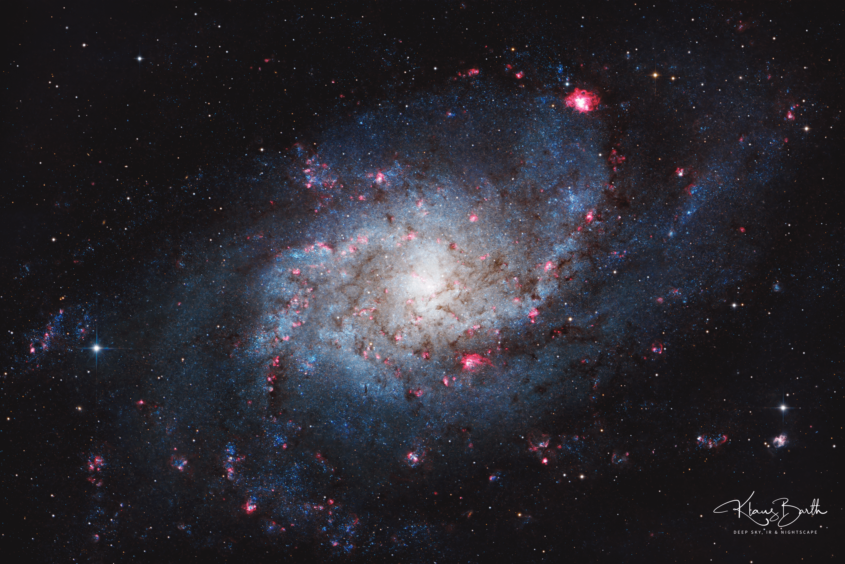 A deep HaRGB view of M33 showing hundreds of glowing H II regions, blue star-forming arms, and delicate dust lanes. Hα highlights massive star-forming complexes like NGC 604, while RGB preserves natural colors across the spiral structure.