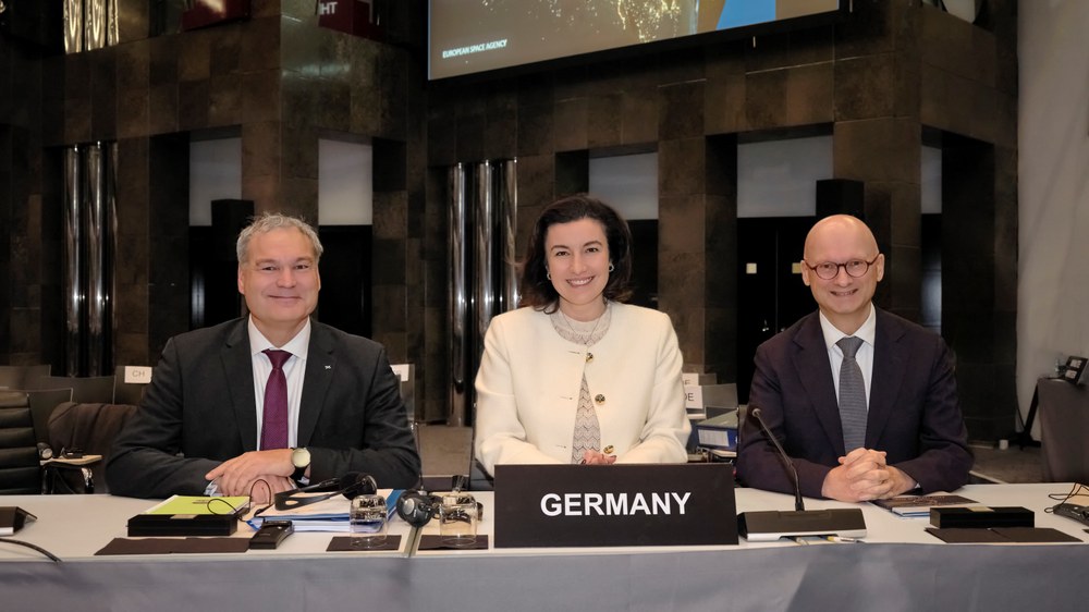 Three years after the previous ESA Council meeting at Ministerial level in Paris, the ministers responsible for space affairs from 23 Member States of the European Space Agency met in Bremen on 26 and 27 November 2025 and allocated a total of 22.1 billion euros to space programmes over the coming years. From left: Walther Pelzer, Member of the DLR Executive Board and Director General of the German Space Agency at DLR; Dorothee Bär, German Federal Minister of Research, Technology and Space; and Marcus Pleyer, State Secretary at the German Federal Ministry of Research, Technology and Space.