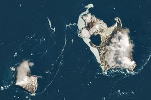 Puffs of low-level clouds mingle with the volcanic terrain of Candlemas and Vindication islands in the remote South Atlantic.