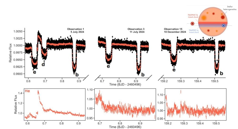 This figure from the research shows some of the results and some of the obstacles that stellar contamination presents. Each panel presents one of the JWST's transit observations, with the panel below showing H-alpha. Peaks in H-alpha represent stellar flaring, and one stellar flare occured right before the egress of planet e. Image Credit: Allen et al. 2025. This figure from the research shows some of the results and some of the obstacles that stellar contamination presents. Each panel presents one of the JWST’s transit observations, with the panel below showing H-alpha. Peaks in H-alpha represent stellar flaring, and one stellar flare occured right before the egress of planet e. Image Credit: Allen et al. 2025.