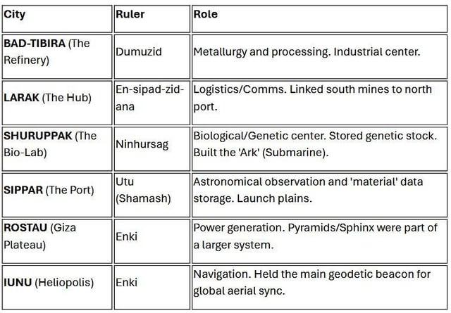 Eridu (Base Zero) was ruled by Enki and served as HQ with coastal access for material intake.