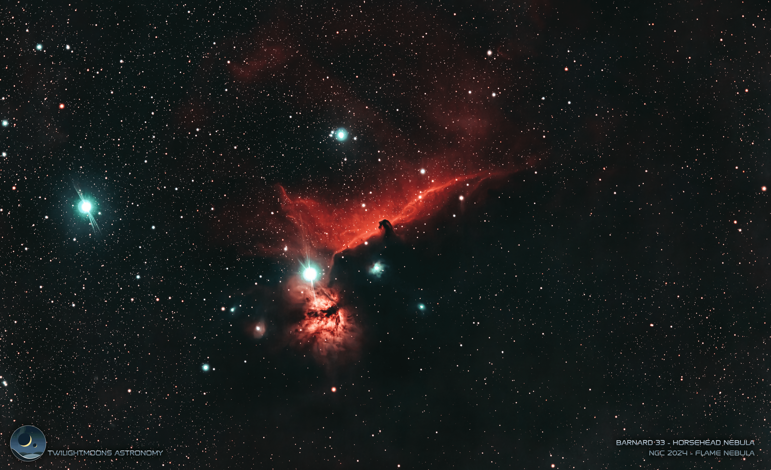 A common winter astrophotography target, the Horsehead and Flame are easily found near Alnitak in Orion, the leftmost of the belt stars.
