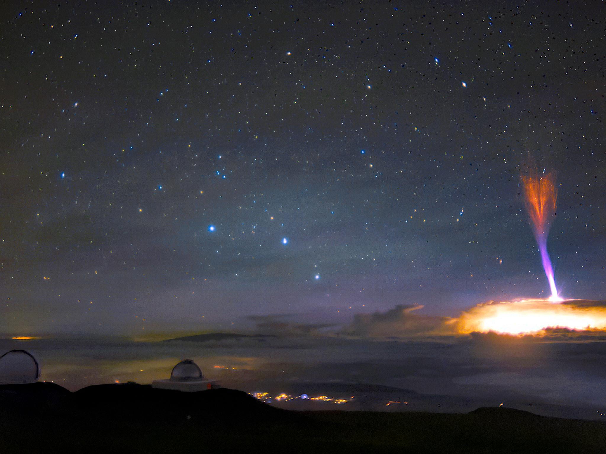 Red sprites are distinctive because of their color, and also the direction in which they strike. The red and blue lights are shooting down from 50-90 kilometers toward the top of the cloud deck. It is extremely rare to capture these phenomena on camera and even more so from this unique perspective.