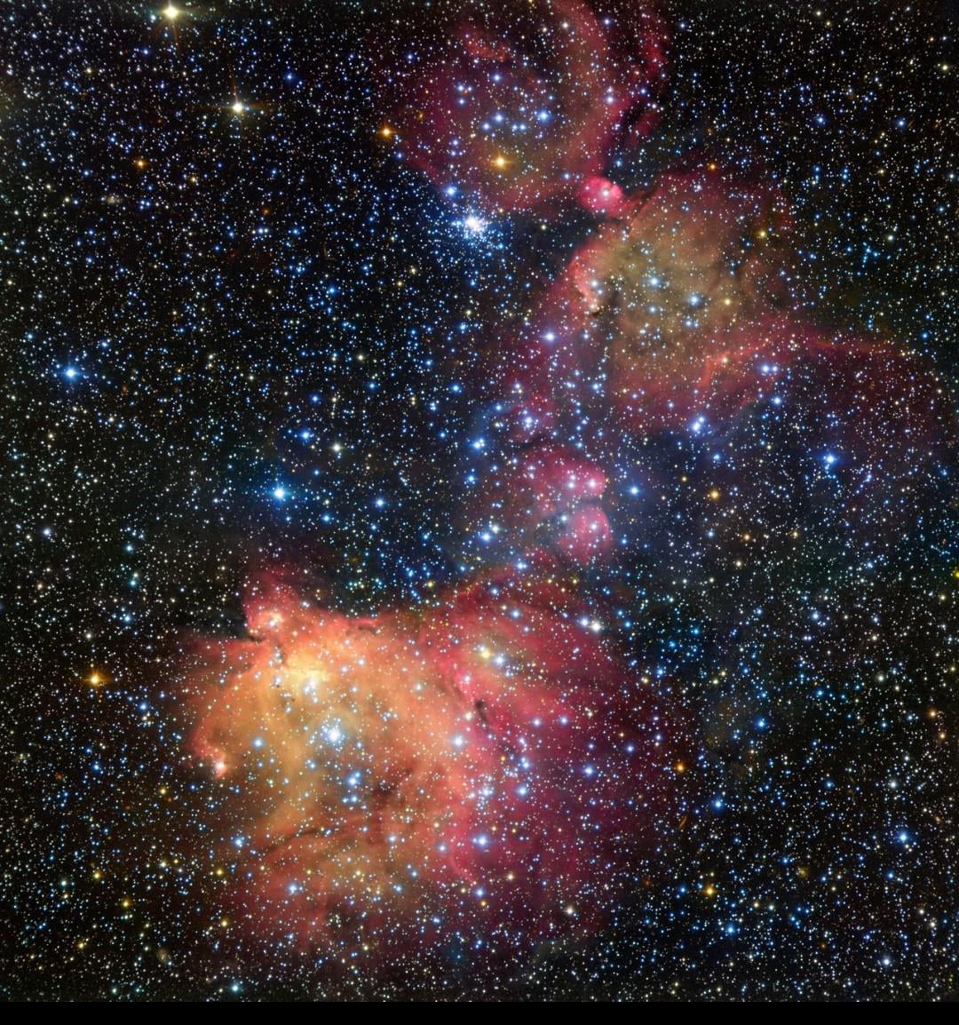 The reddish regions are emission nebulae, where clouds of hydrogen gas are ionized by nearby young, hot stars, producing H-alpha light. The bright points across the image are foreground and background stars within the Milky Way.