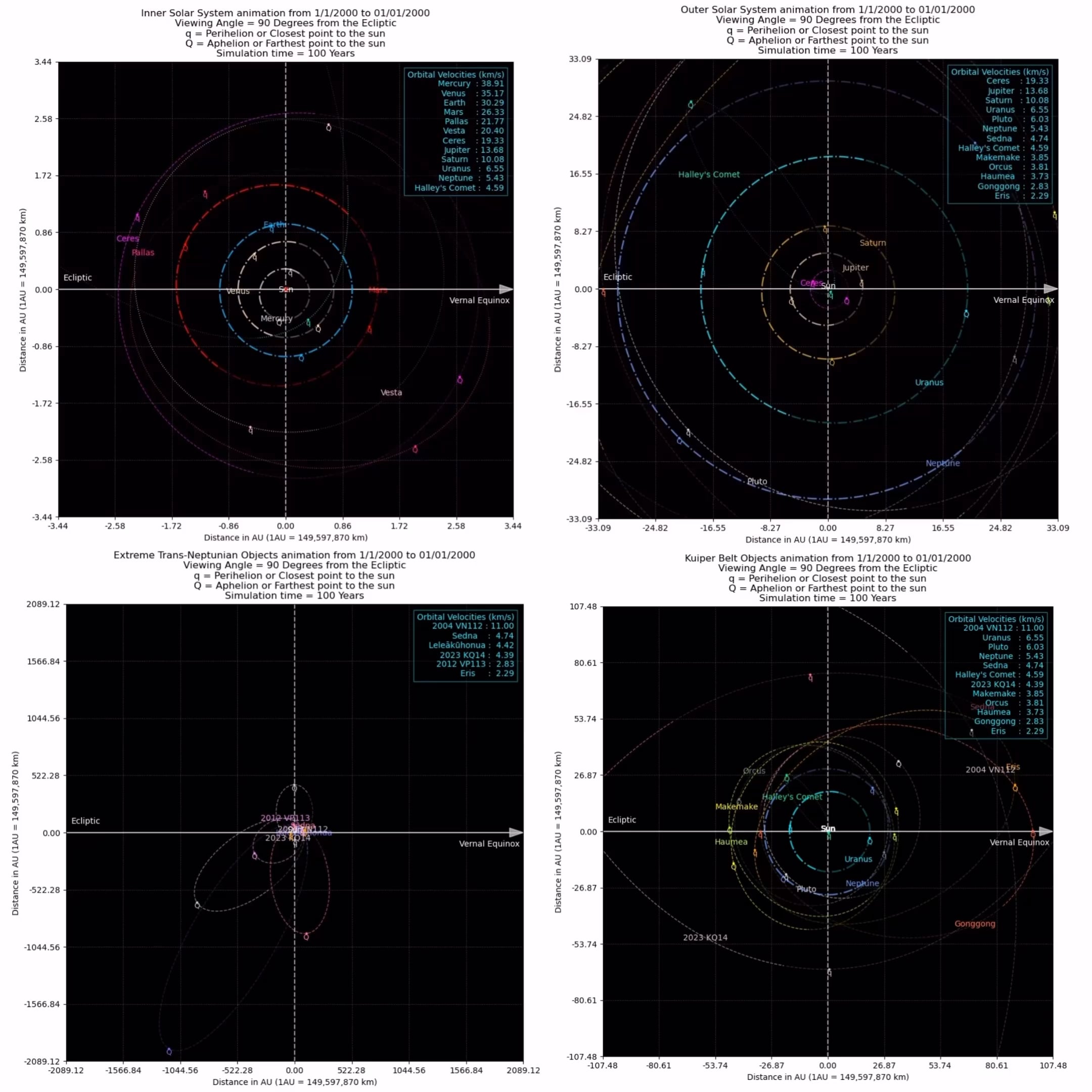 This time I’ve not included the barycenter plot but added a new plot with some extreme trans neptunian objects (sednoids to be specific) all data was pulled from Wikipedia and verified by setting the date to their respective dates of perihelia obtained from Wikipedia itself (Leleākūhonua was a little off on its date of perihelia, I double checked the orbit parameters and can’t tell why it’s happening but the rest are fine)