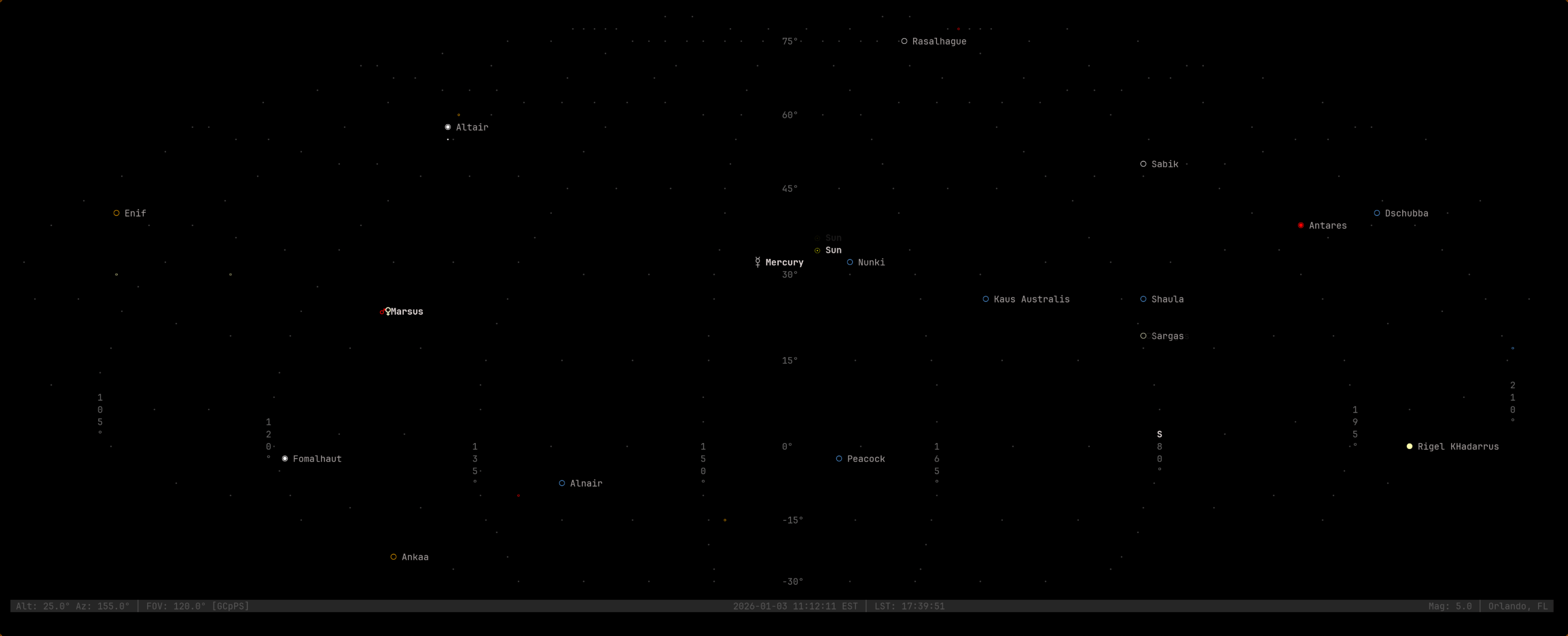 My idea of a planetarium in your terminal. https://github.com/craigderington/skyterm/ by ihackportals