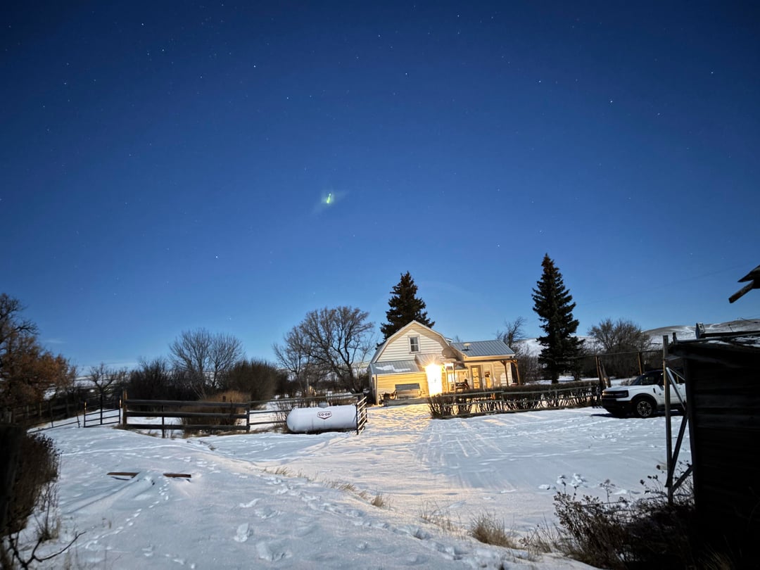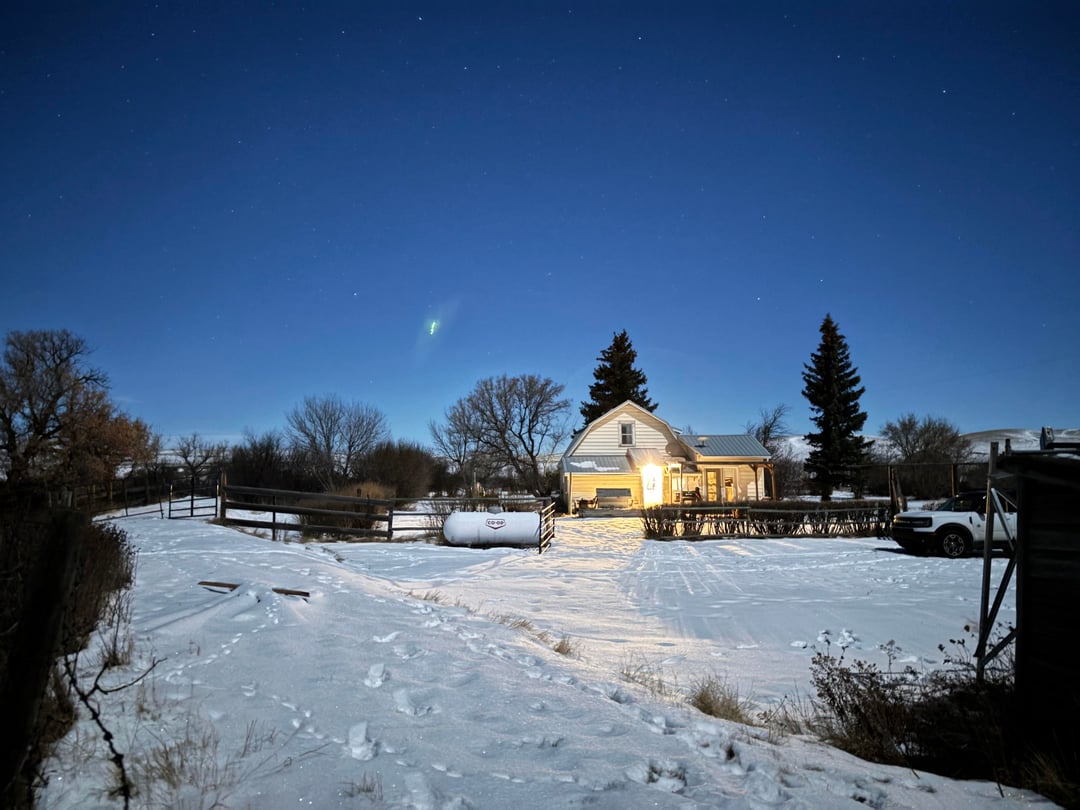 If you were to draw lines from each corner of the image to find the center of the photo you will see that the line in the sky is offset equally from the center in the opposite direction from the house light. This will be the case for both images.