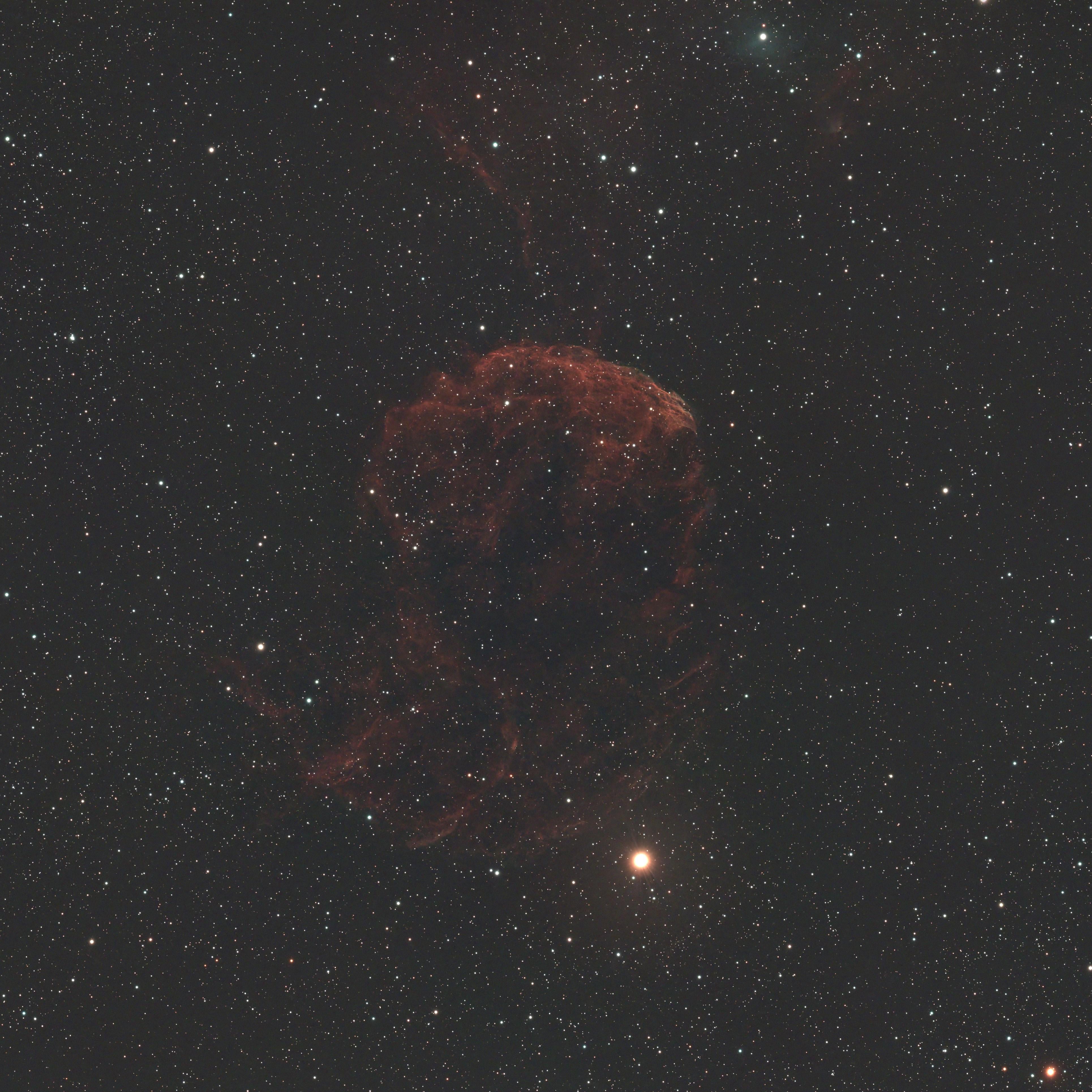 The jellyfish Nebula (IC443) is most likely the remnants of a supernova ~5000 light years away. At 70LY across, its apparent size in the night sky is ~2x the full moon.