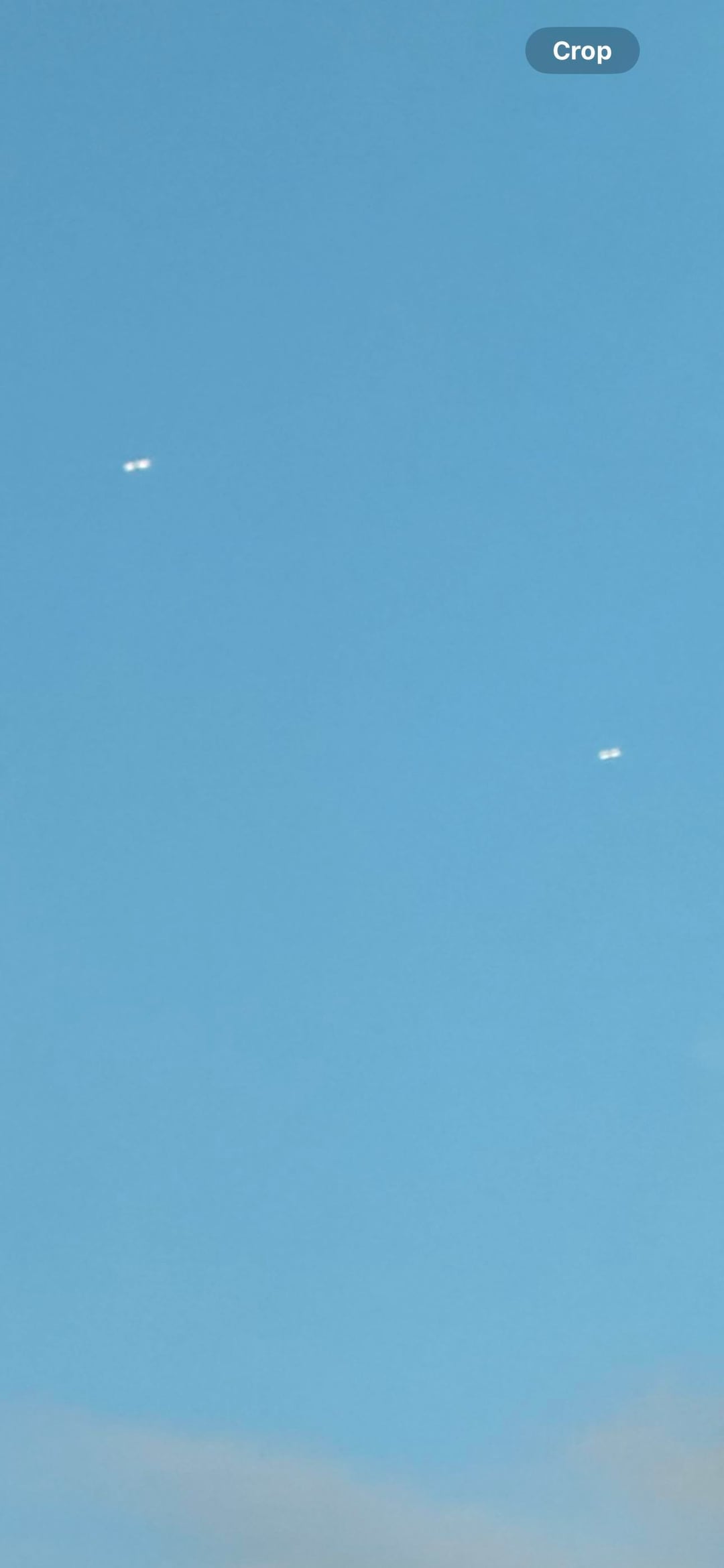 While driving my son to school this morning I see these 2 objects in the sky. I checked flight logs for the airport nearby and no planes had taken off or landed around this time. The 2 objects appeared to just “float” and then when I told my son to look up at them, they were gone. I am posting the original photo and one that I zoomed in on after. Any idea if this is a true sighting or could be something else?