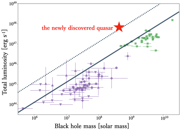 Figure 2: Quasar luminosity (vertical axis), which traces the black hole growth rate, versus black hole mass (horizontal axis), for the newly discovered object (eFEDS J084222.9+001000; red star) and previously observed objects (purple and green symbols). The solid line indicates the theoretical upper limit of the black hole accretion rate (the Eddington limit), while the dashed line indicates gas accretion at ten times this limit. Accurate measurement of the black hole mass, thanks to the Subaru Telescope observations, revealed that this object exhibits super-Eddington accretion, exceeding the Eddington limit. (Credit: NASA/JPL-Caltech)