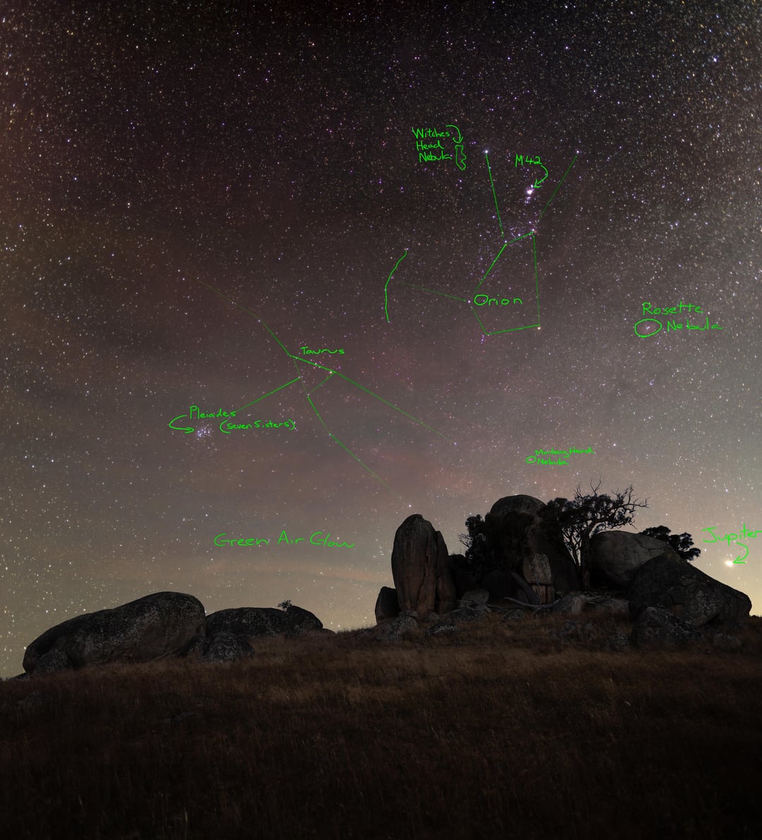 This location always makes me think about timelines; those granite boulders are likely around 400 million years old while the bright blue Pleiades cluster (middle left) are only around 100 million years old. Those blue stars formed AFTER those boulders.