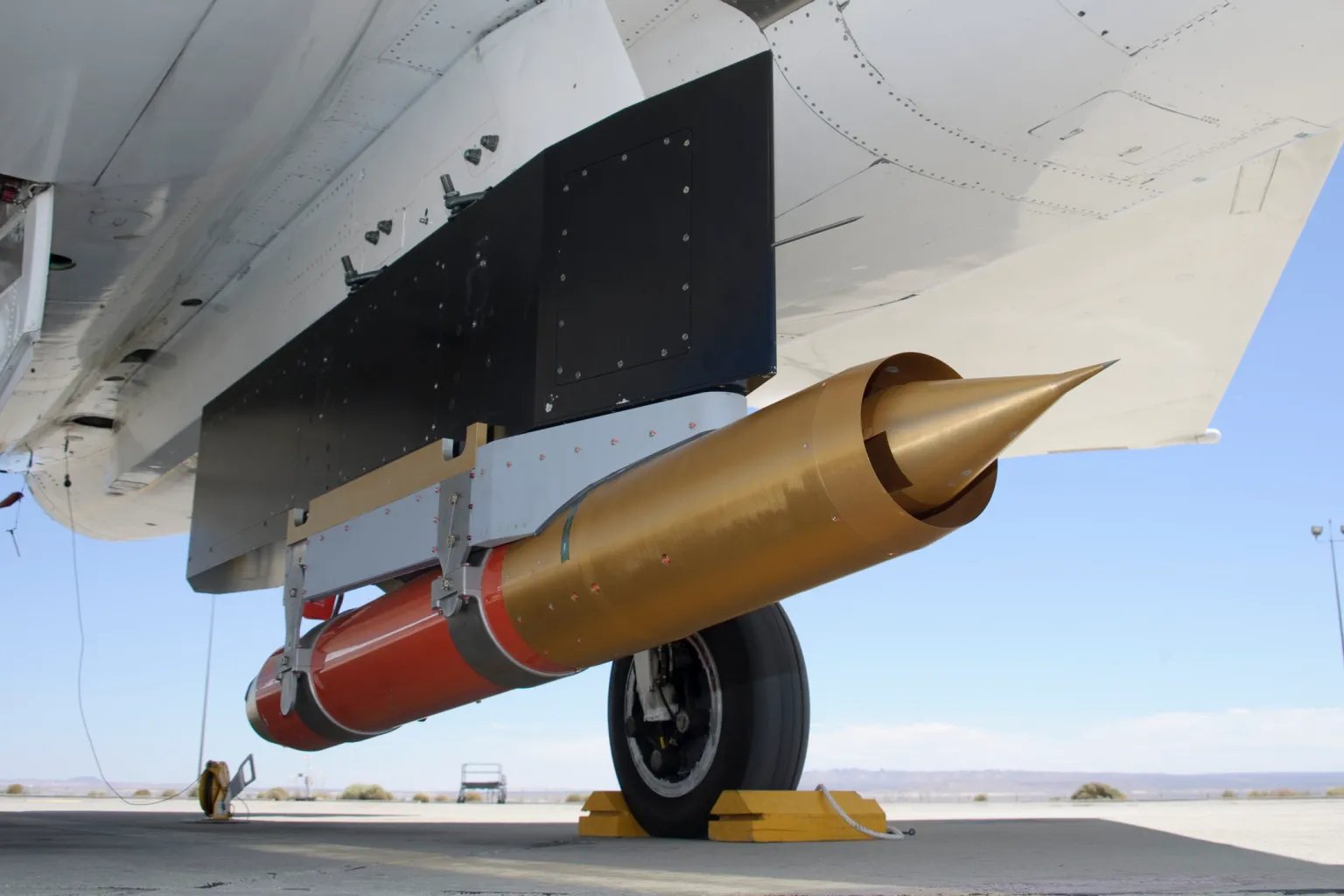 NASA’s F-15B research aircraft, with the 3-foot-tall test article mounted on its underside. NASA/Christopher LC Clark