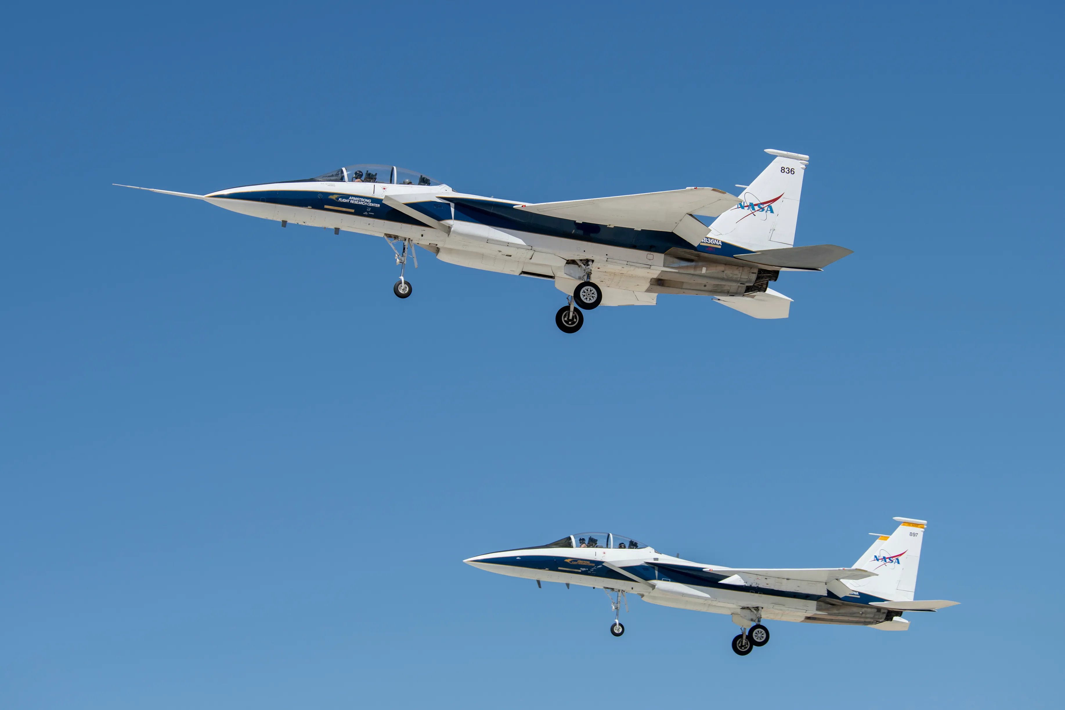 Two of NASA’s F-15 research aircraft take off in support of the agency’s Shock-Sensing Probe (SSP) research flight series at the Armstrong Flight Research Center at Edwards, California. For SSP, NASA mounted a state-of-the-art data probe on the nose of an F-15, with the goal of testing its ability to measure the shock waves of another aircraft flying at supersonic speeds. NASA/Carla Thomas