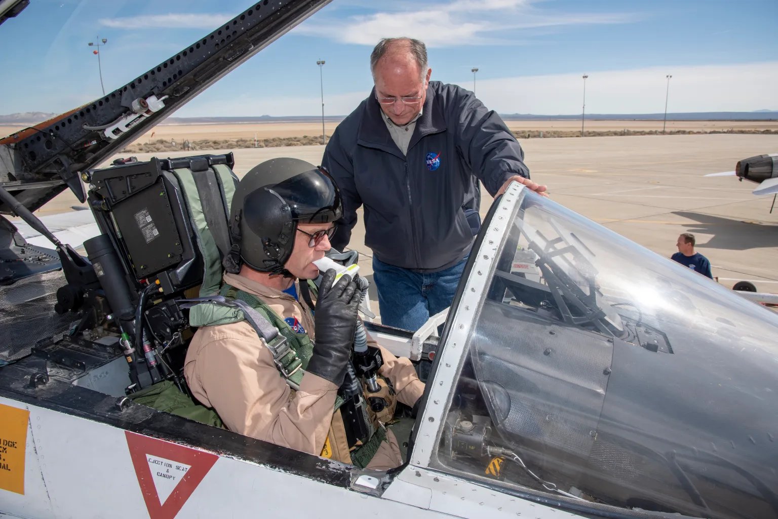 Phillip Wellner from NASA Life Support conducts a spirometry test on NASA test pilot Nils Larson before a Pilot Breathing Assessment flight at NASA’s Armstrong Flight Research Center in California. NASA/Carla Thomas