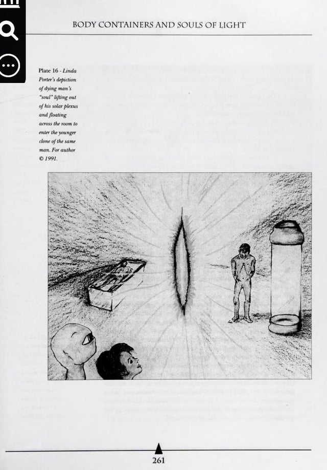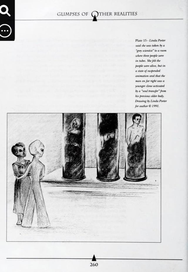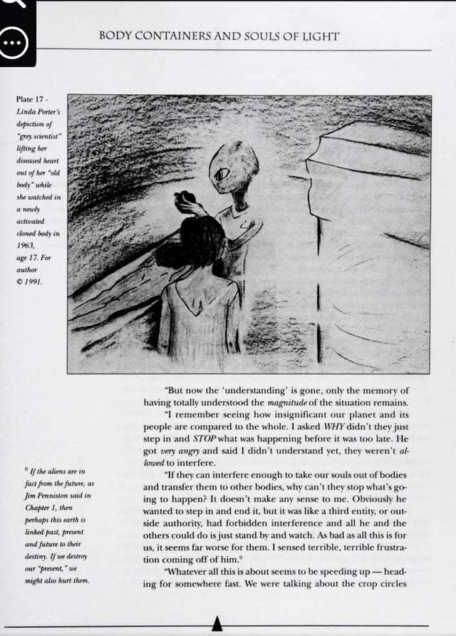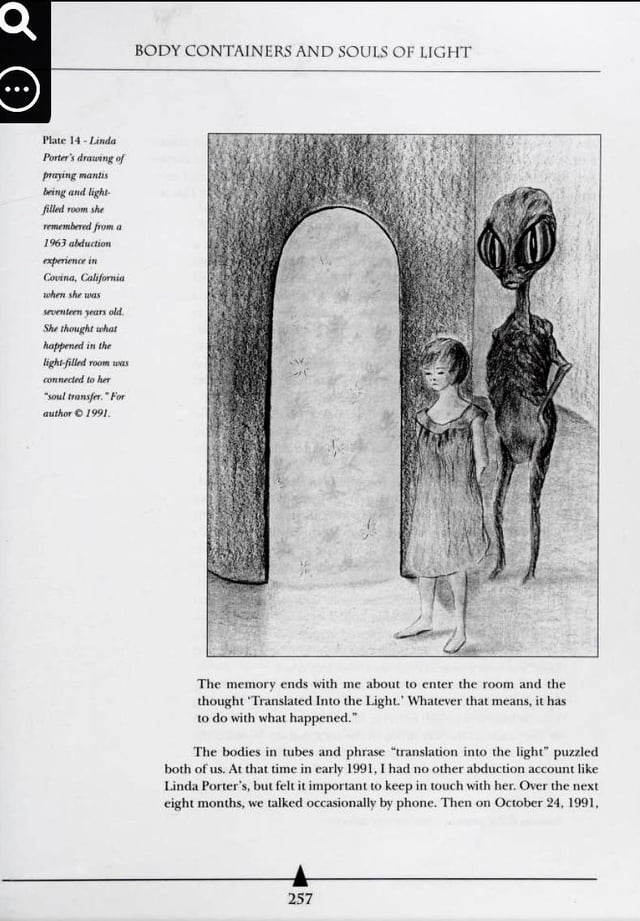 As she grew older, Porter began recalling more details and decided to create drawings of what she remembered. These illustrations included depictions of the mantis being, the interior spaces she observed, and symbolic or procedural elements connected to the consciousness transfer. She later sent these drawings, along with letters and cassette recordings describing her experiences, to Linda Moulton Howe. Howe referenced the material in Glimpses of Other Realities Volume II, and it has been cited in discussions of mantis type entities in the UFO literature.