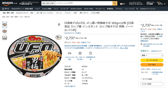 The suggested retail price of ‘Nissin Yakisoba UFO Bukko Otoko Ume Yakisoba’ is 236 yen excluding tax. On Amazon, a 12-meal set was sold for 2,737 yen including tax (228 yen per meal).