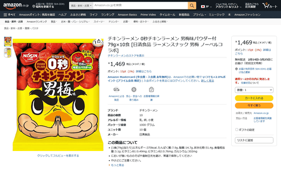 In addition, the suggested retail price of ‘0 Second Chicken Ramen with Otokoume Powder’ is 136 yen excluding tax. On Amazon, a 10-meal set was sold for 1,469 yen including tax (147 yen per meal).