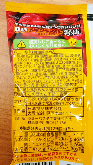 The ingredients are as follows: seasoning powder, processed plum, and bonito flakes. One serving (79g) contains 370kcal.