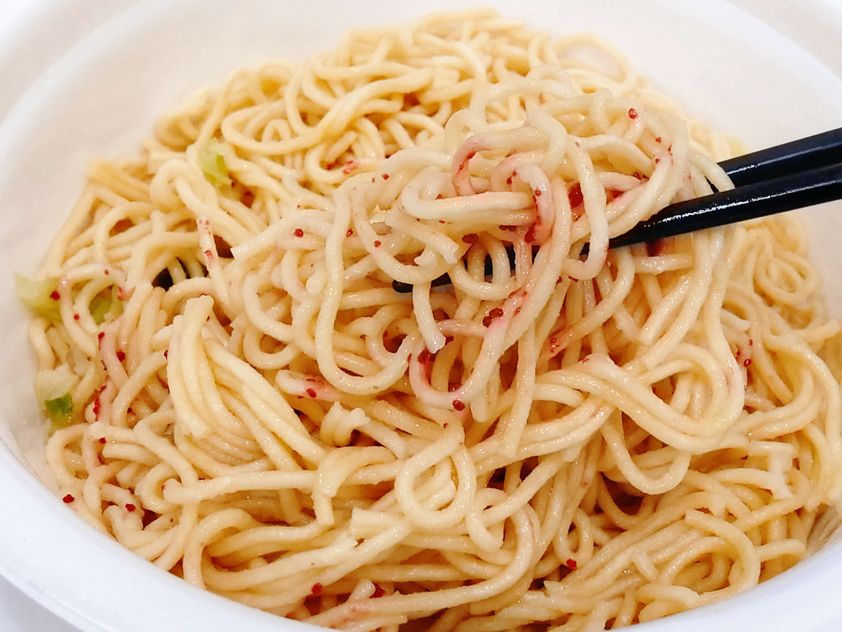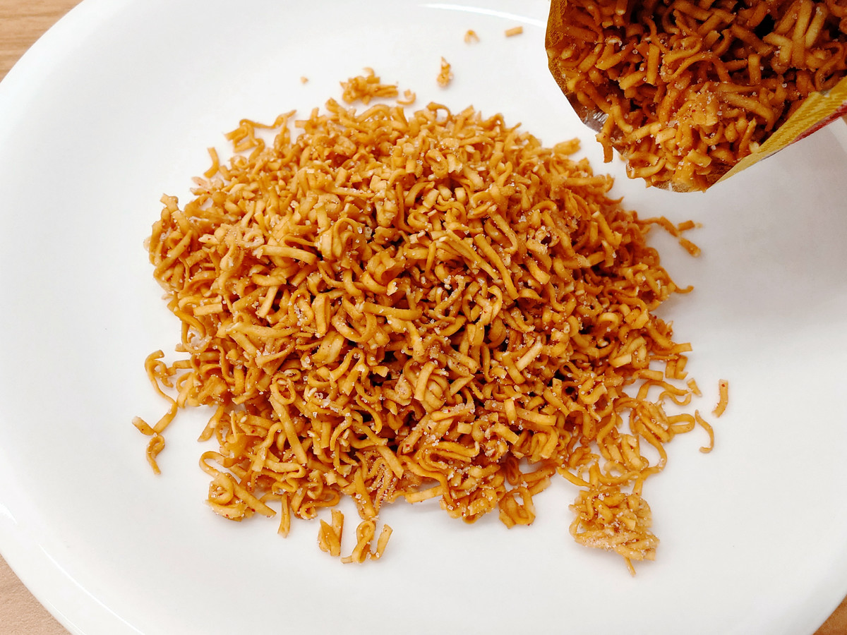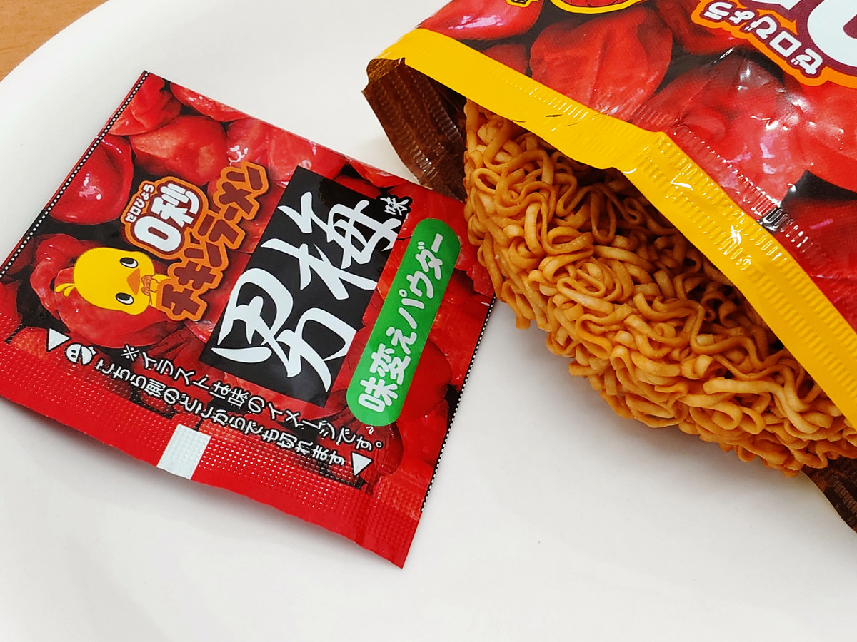 This is what it looks like when you lightly shake the bag and take it out. The saltiness of the 0-second Chicken Ramen is enveloped in the sourness of the Otokoume plum, creating a wonderful flavor change. This also doesn’t leave a sour aftertaste, so it’s a well-balanced combination of ‘0-second Chicken Ramen with the taste of Otokoume plum.’