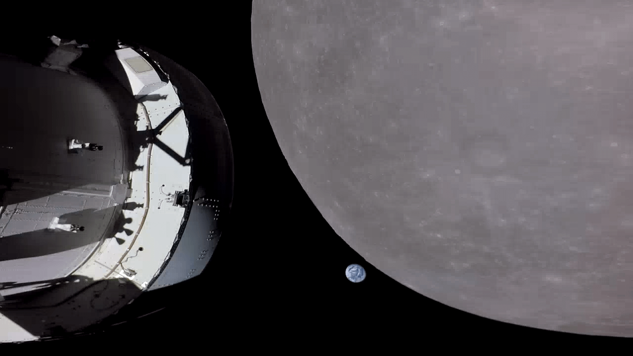 **Explanation:** [Eight billion people](https://www.un.org/en/dayof8billion) are about to disappear in this [snapshot from space](https://www.flickr.com/photos/nasa2explore/albums/72177720303788800/page3) taken on 2022 November 21. On the [sixth day of the Artemis I mission](https://blogs.nasa.gov/artemis/2022/11/21/artemis-i-flight-day-six-orion-performs-lunar-flyby-closest-outbound-approach/), their home world is setting behind the Moon’s bright edge as viewed by an [external camera](https://www.nasa.gov/feature/nasa-s-artemis-i-cameras-to-offer-new-views-of-orion-earth-moon) on the outbound Orion spacecraft. Orion was headed for a powered flyby that took it to within 130 kilometers of the lunar surface. Velocity gained in the flyby maneuver was used to reach a [distant retrograde orbit](https://www.nasa.gov/feature/orion-will-go-the-distance-in-retrograde-orbit-during-artemis-i) around the Moon. That orbit is considered distant because it’s another 92,000 kilometers beyond the Moon, and retrograde because the spacecraft orbited in the opposite direction of the Moon’s orbit around planet Earth. [Swinging around the Moon](https://www.nasa.gov/specials/trackartemis/), Orion reached a maximum distance (just over 400,000 kilometers) from Earth on 2022 November 28, exceeding a record set by [Apollo 13 for most distant](https://apod.nasa.gov/apod/ap200303.html) spacecraft designed for [human space exploration](https://www.nasa.gov/artemis-1). [The Artemis II mission](https://www.nasa.gov/mission/artemis-ii/), carrying 4 astronauts around the moon and back again, is due to launch as early as February 6.