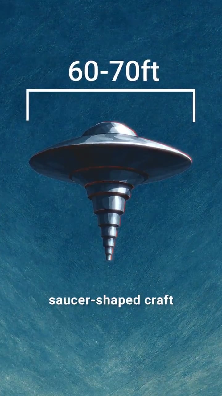 It was described as a saucer-shaped craft ~60–70 ft long with a long, telescopic/segmented vertical structure fixed underneath, estimated ~20 ft in length. The surface was very reflective, aluminum-metallic, with no visible lights. Relative motion appeared slow or stationary compared to a normal crossing airplane. Size was judged as about half a Boeing 737. Total on-scene observation was 5–7 seconds. No emissions, interaction with surroundings, or electromagnetic effects were noted.