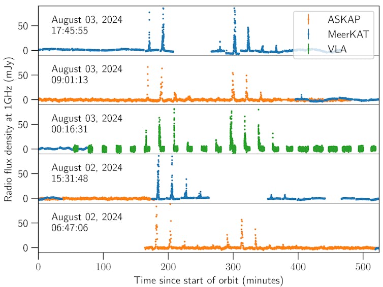 We watched GPM J1839-10 in a series dubbed “round-the-world” observations. These used three telescopes, each passing the source to the next as Earth rotated: the Australian SKA Pathfinder or ASKAP, the MeerKAT radio telescope in South Africa, and the Karl G. Jansky Very Large Array in the United States.
