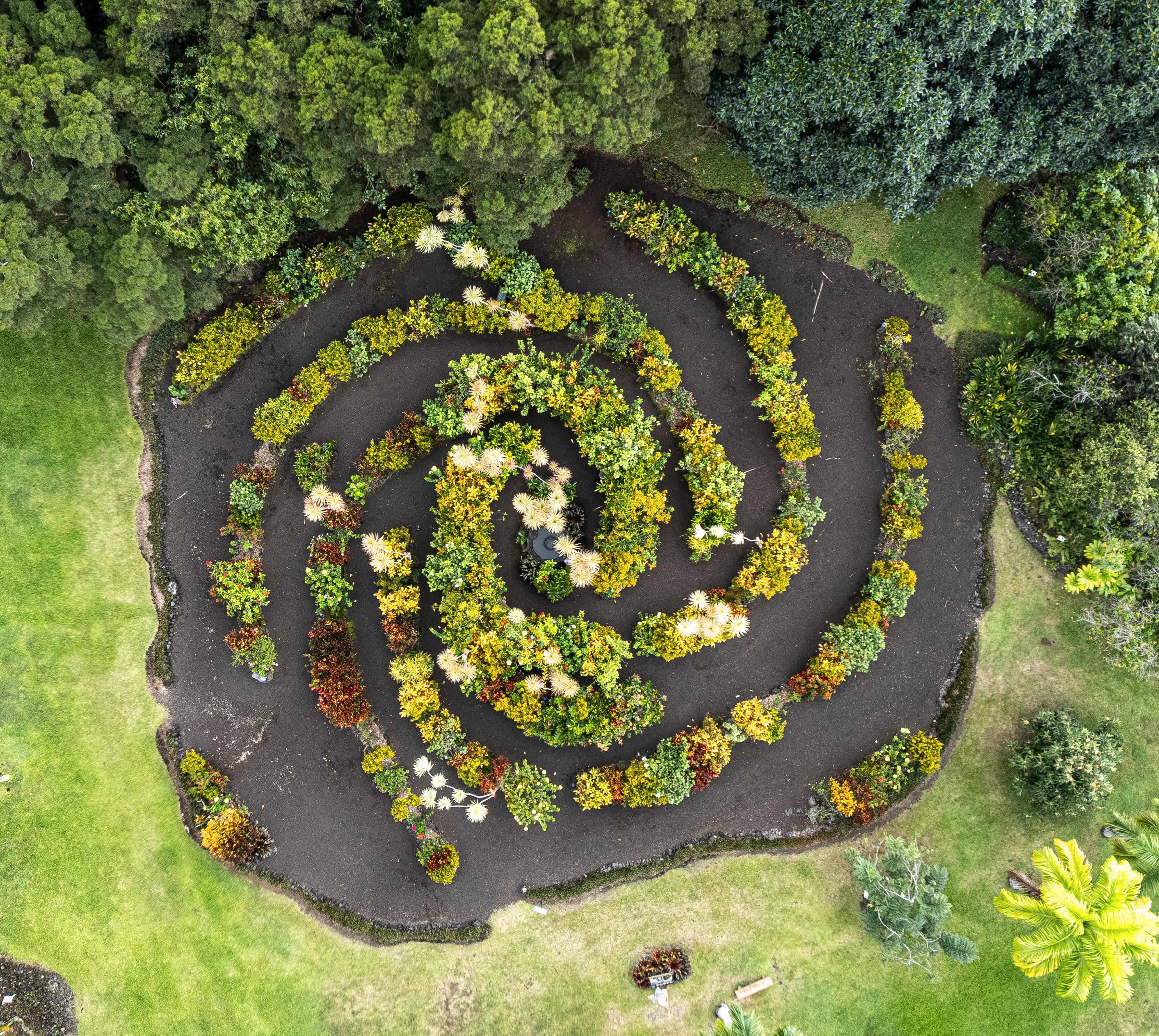 This is the Galaxy Garden at the Paleaku Peace Garden on the Big Island of Hawaii. It semi-realistically maps the Milky Way's actual spiral arms at a scale of 1' = 1000 lightyears. Specific species of flowers represent types of nebulae, and there is an onyx hyperbola-shaped water fountain in the center representing the Sgr A* bla k hole and its jet.