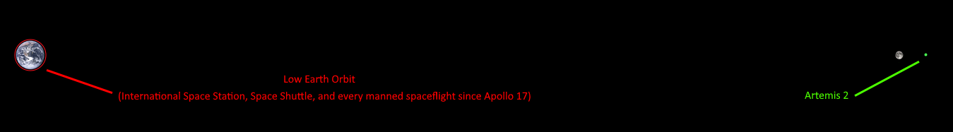 For all the “they’re not REALLY going to the moon since they aren’t landing” people: a to-scale reminder of just how much further Artemis II travels than every mission of the past 53 years