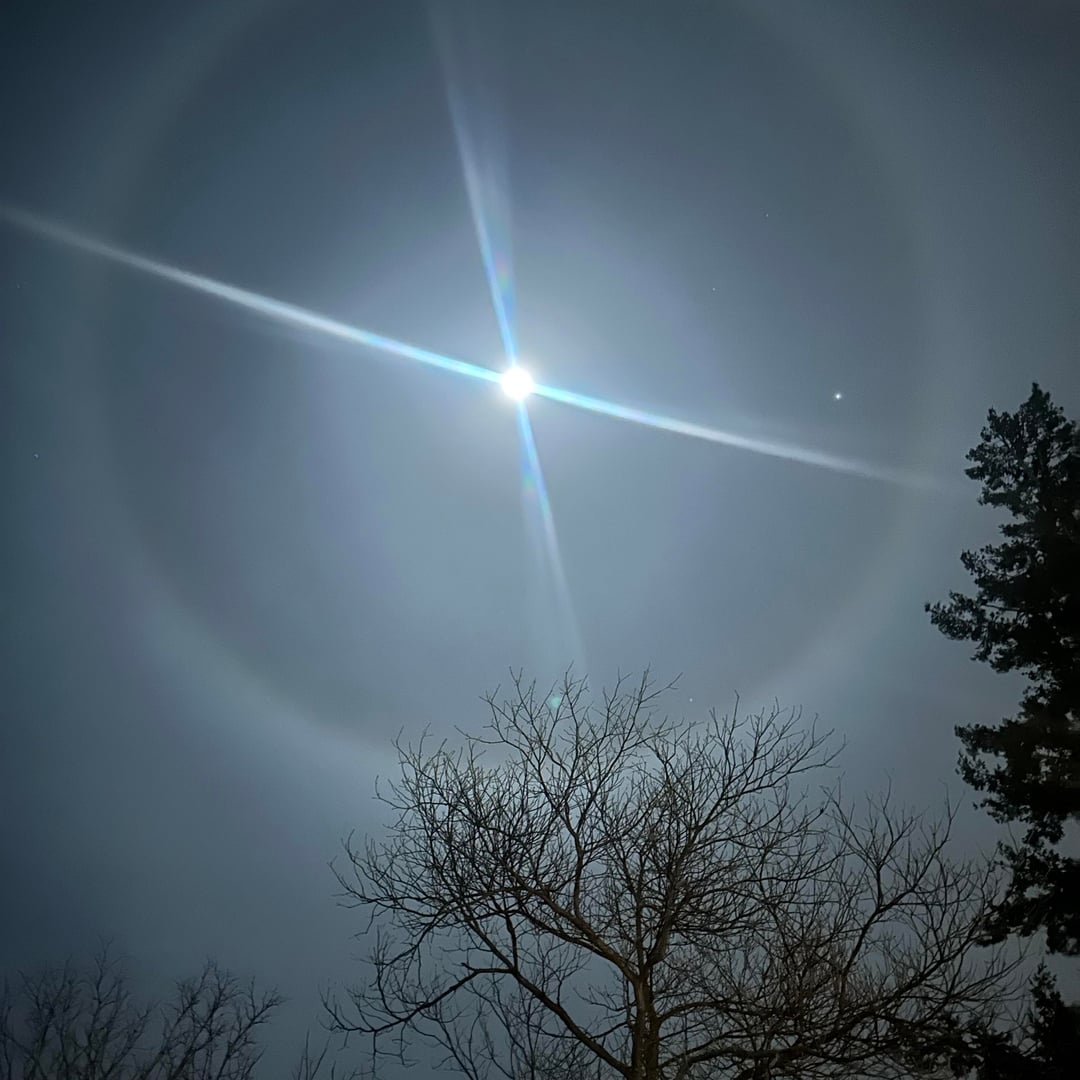 Moonring! It’s a halo formed around the moon (and sun as well!) by atmospheric ice crystals. They tend to show up when it’s bitterly cold out and there’s wispy cirrus clouds. If you see two bright spots at the 3:00 and 9:00 positions, those are called moondogs or paraselenae.