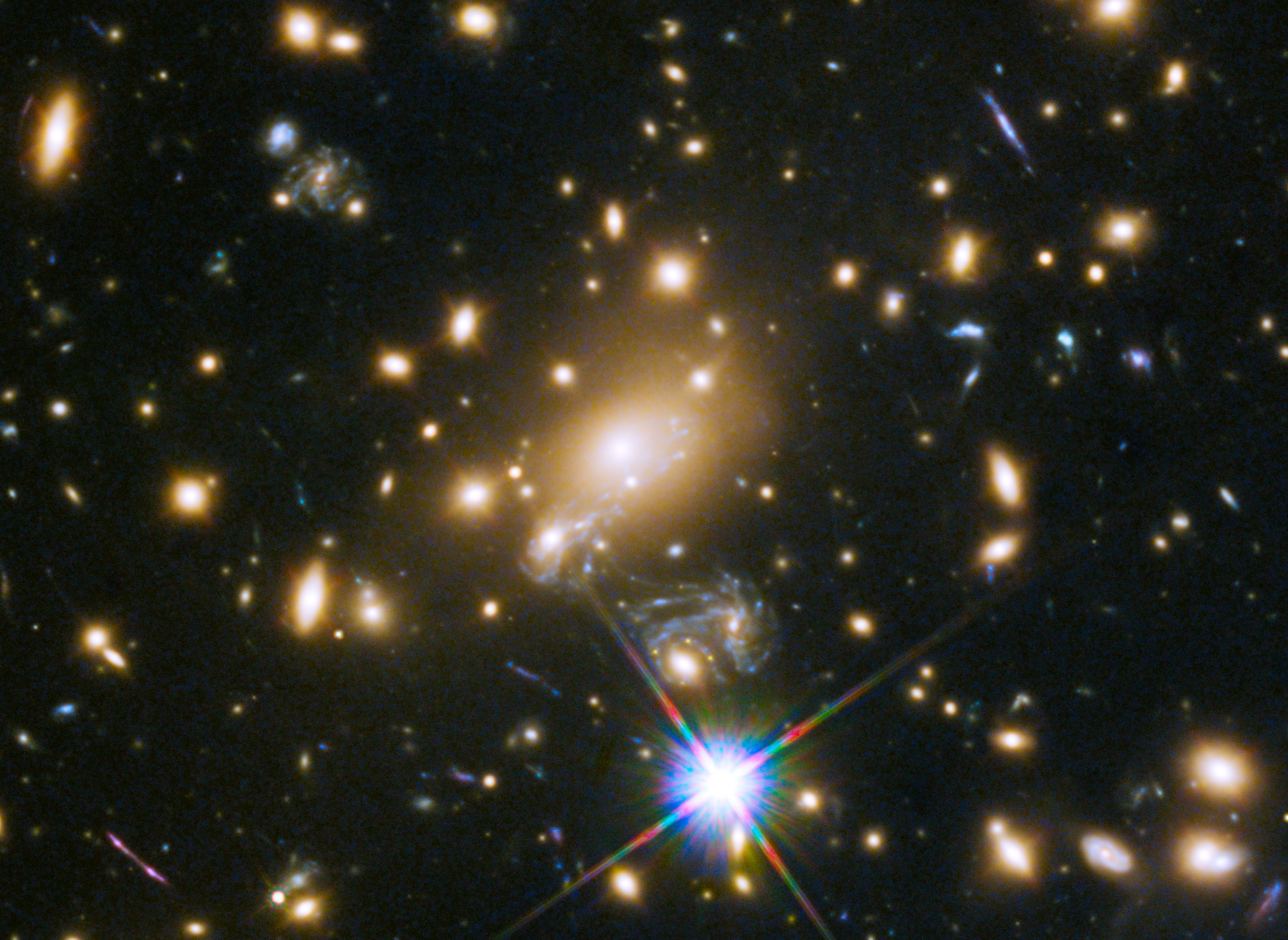 This image shows the huge galaxy cluster MACS J1149.5+223, whose light took over 5 billion years to reach us. The huge mass of the cluster is bending the light from more distant objects. The light from these objects has been magnified and distorted due to gravitational lensing. The same effect is creating multiple images of the same distant objects. Meanwhile, the central location of the cluster clearly shows intracluster light: a remarkable tracer of dark matter.